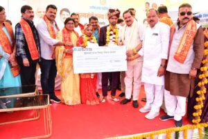 सामुहिक विवाह कार्यक्रम में उपस्थित अतिथियों द्वारा नव विवाहित जोड़ों को आशीर्वाद प्रदान करते हुए शासन द्वारा स्वीकृत राशि रुपए 49,000 के प्रतीकात्मक चेक एवं उपहार प्रदान किए गए.