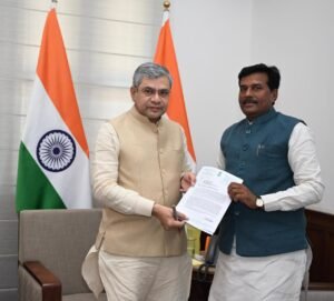 ग्वालियर। ग्वालियर सांसद भारत सिंह कुशवाह ने केंद्रीय रेल मंत्री अश्विनी वैष्णव से सौजन्य भेंट कर ग्वालियर संसदीय क्षेत्र के डबरा शहर में आर.ओ.बी. (रेलवे कॉसिंग ठाकुर बाबा मंदिर के पास) के निर्माण के संबंध में अनुरोध पत्र सौंपा।