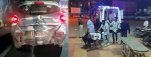 नीमच। मालखेड़ा फोर लाइन हाइवे बाईपास चौराहे पर रविवार रात को एक गंभीर सडक़ हादसा हुआ। स्पीड ब्रेकर की अधिक ऊंचाई के कारण एक कार के अचानक ब्रेक लगाने से पीछे से आ रही दो कारें उससे टकरा गईं। टक्कर इतनी जबरदस्त थी कि तीनों गाडिय़ों के परखच्चे उड़ गए।