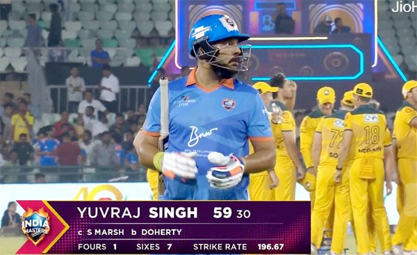 रायपुर, (वार्ता) युवराज सिंह की 30 गेंदों पर खेली गई 59 रनों की तूफानी पारी की बदौलत इंडिया मास्टर्स ने ऑस्ट्रेलिया मास्टर्स को 94 रनों से हराकर पहली इंटरनेशनल मास्टर्स लीग (आईएमएल) 2025 के फाइनल में जगह बना ली है।