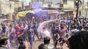 नरसिंहगढ़। नगर में रियासतकाल से रंगपंचमी के दिन विशाल गेर ठाकुरजी के विमान के साथ नगर में निकाली जाती है. गेर में मुख्य आकर्षण का केन्द्र डोलचा मार होली होती है. हर बार की तरह इस बार भी धर्मशाला मंदिर से पूजा-अर्चना, महाआरती पश्चात ठाकुरजी के विमान के साथ गेर प्रारंभ हुई. चौराहों पर डोलचा मार होली जमकर मची. युवाओं, बच्चों एवं बड़ो की टोलियां एक-दूसरे पर डोलचे में रंग भरकर मार रहे थे. एक नजर देखने से ही हर कोई अचंभित हो जाता है किंतु नगर में दशकों से डोलचा मार होली की परंपरा चली आ रही है जिसका वर्ष भर लोगों को बेसब्री से इंतजार रहता है. स्थान-स्थान पर विमान की पूजा-अर्चना कर आरती उतारी गई. गेर डा. शिवजी का चौक, दीनाजी का चौराहा, फूलबाग, चम्पी चौराहा, छतरी चौराहा, पुरानी नगर पालिका, कसेरा बाजार, शाजापुर वाला चौराहा, छारबाग, सुभाष चौक, पाण्डव चौराहा, बाराद्वारी, पाल रोड, थावरिया, बड़ा बाजार, सूरजपोल, रामकुण्ड होते हुए पुन: मंदिर पहुंची. चौराहों पर रंग, गुलाल से भरी टंकियों से हुरियारों पर रंग डाला जा रहा था. नपा की फायर ब्रिगेड रंगों की बौछार छोड़ते हुए चल रही थी.