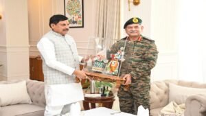 भोपाल:मुख्यमंत्री डॉ मोहन यादव से थल सेना प्रमुख जनरल उपेंद्र द्विवेदी ने आज मुख्यमंत्री निवास स्थित समत्व भवन में सौजन्य भेंट की।मुख्यमंत्री डॉक्टर यादव ने पुष्प गुच्छ, अंग वस्त्रम और राजा भोज की मूर्ति भेंट कर थल सेना प्रमुख द्विवेदी का स्वागत किया।