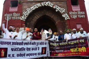 भोपाल। आज मध्यप्रदेश सर्वधर्म सद्भावना मंच की और से सभी धर्मों के धर्म गुरुओं की अगुवाई में आज शहीद गेट स्टेट बैंक पर केंडल जला कर पहल गाम शहीदों को मध्यप्रदेश सर्वधर्म सद्भावना मंच के पदाधिकारियों धर्मगुरुओं द्वारा श्रद्धांजलि अर्पित की गई एवं आतंकवाद विरोधी नारे गूंजे जिसमे भारत सरकार से आतंकवाद के विरुद्ध सख्त से सख्त कार्यवाही करने एवं और आतंकवादीयो को फाँसी की मांग की गई एवं केंद्रीय सरकार से शहीदों के परिवार को उचित मुआवजा देने की मांग की गई सर्वधर्म के अनुयायियों द्वारा आतंगवाद के विरोध में एक जुट होकर आवाज़ बुलंद की गई श्रद्धाजंलि कार्यक्रम में भाग लेकर पहल गाम शहीदों को श्रद्धासुमन अर्पित करने में बौद्ध धर्म शाक्य पुत्र भंते सागर थेरो, जमीअत उलमा मध्यप्रदेश के अध्यक्ष हाजी मोहम्मद हारून,डॉक्टर फादर आनंद मुदुगल आर्च बिशप दुराई राज जी प्रोफेसर मनोज जैन ज्ञानी गुरवेंद्र सिंह ज्ञानी दलीप सिंह गुरुचरण सिंह अरोड़ा राजेन्द्र कोठरी शैलेन्द्र शेली दीपचंद यादव भंते राहुल हैदर यार खान इक़बाल मसूद मोहम्मद कलीम एडवोकेट डेनोयल रिचर्ड हाजी मोहम्मद इमरान आयोजक कार्यक्रम मध्यप्रदेश सर्वधर्म सद्भावना मंच उपस्थित रहे एवं बड़ी संख्या में लोगो ने भाग लेकर शहीदों को श्रद्धांजलि अर्पित की।