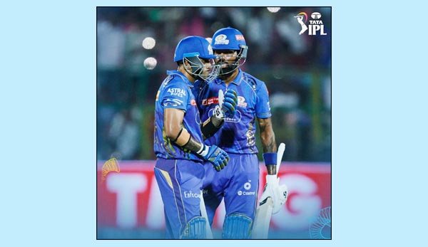 आज यहां राजस्थान रॉयल्स के कप्तान रियान पराग ने टॉस जीतने के बाद पहले गेंदबाजी करने का फैसला किया। बल्लेबाजी करने उतरी मुम्बई के लिए रायन निरलटन और रोहित शर्मा की सलामी जोड़ी ने अच्छी शुरुआत करते हुए पहले विकेट के लिए 116 रन जोड़े। 12वें ओवर में महीश तीक्षणा ने रायन रिकलटन को बोल्ड कर राजस्थान को पहली सफलता दिलाई। रिकलटन ने 38 गेंदों में सात चौके और तीन छक्कों की मदद से (63) रन बनाये। मुम्बई का दूसरा विकेट रोहित शर्मा के रूप में गिरा। 13वें ओवर में रियान पराग की गेंद पर बड़ा शॉट खेलने के चक्कर में रोहित शर्मा को यशस्वी जायसवाल ने लांग ऑफ पर लपक लिया। रोहित शर्मा ने 36 गेंदों में नौ चौके लगाते हुए (53) रनों की पारी खेली। मुम्बई इंडियंस ने निर्धारित 20 ओवरों में दो विकेट पर 217 रनों का विशाल स्कोर खड़ा किया। सूर्यकुमार यादव ने 23 गेंदों में चार चौके और तीन छक्के लगाते हुए (नाबाद 48) रन बनाये। वहीं कप्तान हार्दिक पंड्या ने 23 गेंदों में छह चौके ओर एक छक्के की मदद से (नाबाद 48) रनों की पारी खेली।