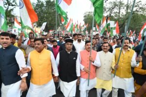 भोपाल। आज शाम भाजपा की रोशनपुरा चौराहे से शुरू हुई तिरंगा यात्रा एमवीएम चौराहा पर समाप्त हुई, जिसमें मुख्यमंत्री डॉ. मोहन यादव, भाजपा प्रदेश अध्यक्ष व सांसद विष्णुदत्त शर्मा, प्रदेश प्रभारी डॉ. महेन्द्र सिंह समेत हजारों नागरिकों ने भाग लिया। सभी समाजों के धर्मगुरू, सामाजिक व व्यापारिक संगठनों के सदस्य हाथों में तिरंगा लेकर देशभक्ति के नारों से गूँज उठे। मुख्यमंत्री ने प्रधानमंत्री नरेंद्र मोदी के नेतृत्व में ऑपरेशन सिंदूर की सफलता पर सेना और देशवासियों को बधाई दी। भाजपा अध्यक्ष ने आतंकवाद के खिलाफ भारत की सशक्त कार्रवाई का सम्मान करते हुए सुरक्षा बलों की प्रशंसा की। सोफिया कुरैशी और व्योमिका सिंह के सम्मान में भी यह यात्रा निकाली गई। कार्यक्रम में कई मंत्री, विधायक, और गणमान्य नागरिक भी शामिल हुए। मुख्यमंत्री डॉ. मोहन यादव ने कहा कि प्रधानमंत्री नरेन्द्र मोदी के नेतृत्व में सेना ने पाकिस्तान प्रेरित आतंकवाद को पस्त किया है। पहलगाम आतंकी हमले में हमारी बहनों का सिंदूर उजाड़ने वाले आतंकियों को भारत ने अपनी भाषा में जवाब दिया है। भाजपा प्रदेश अध्यक्ष व सांसद विष्णुदत्त शर्मा ने कहा कि प्रधानमंत्री नरेन्द्र मोदी के नेतृत्व में केन्द्र सरकार पाक प्रेरित आतंकवाद को जड़-मूल से नष्ट करने को संकल्पित हैं। देश की तीनों सेनाओं ने आतंकवादियों और दुश्मन देश को बताया कि पाक में बैठे आतंक के आका उसकी पहुंच से दूर नहीं हैं।