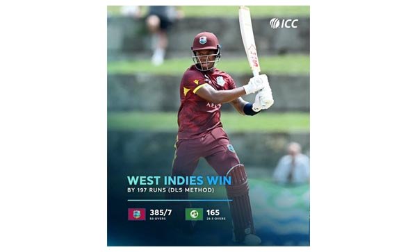 डबलिन, 26 मई (वार्ता) केसी कार्टी (170) की शानदार शतकीय, कप्तान शे होप (75) और जस्टिन ग्रीव्स (50) की अर्धशतकीय पारियों के बाद जेडेन सील्स (तीन विकेट) की बेहतरीन गेंदबाजी की बदौलत वेस्टइंडीज ने तीसरे एकदिवसीय वर्षा बाधित मुकाबले में डकवर्थ-लुईस स्टर्न पद्धति (डीएलएस पद्धति) से आयरलैंड को 97 रनों से हरा दिया। इसी के साथ वेस्टइंडीज ने तीन मैचों की एकदिवसीय सीरीज में 1-1 से बराबरी कर ली है। केसी कार्टी को उनके शानदार प्रदर्शन के लिए ‘प्लेयर ऑफ द मैच’ तथा ‘प्लेयर ऑफ द सीरीज’ से नवाजा गया।