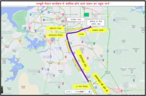 मुबारकपुर जोड़, लांबाखेड़ा जोड़, चौपड़ा जोड़, पटेल नगर बायपास, आनंद नगर होकर जम्बूरी मैदान पार्किंग।