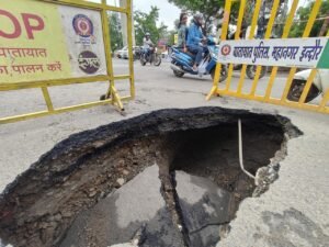 इंदौर:एमआर 10 पर स्मार्ट सड़क धंस गई. इतनी धंस गई है कि पूरी कार उसमे आसानी से समा जाएं. शुक्र है भगवान का कि कोई गड्डे में नहीं गिरा, वरना किसी के घर शोक होता और निगम अधिकारी और जनप्रतिनिधि लीपापोती कर रहे होते!आज शहर की सबसे व्यस्ततम सड़क एमआर 10 पर मेघदूत उपवन के सामने सड़क धंस गई. यह सड़क को भाजपा परिषद द्वारा स्मार्ट सड़क बताकर प्रचारित किया जाता है. आज स्मार्ट सड़क पर लापरवाही और भ्रष्टाचार की पोल खुल गई.