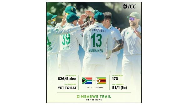 बुलावायो, 07 जुलाई (वार्ता) वियान मुल्डर (नाबाद 367), प्रेनेलन सुब्रयेन (चार विकेट), कोडी युसुफ, कॉर्बिन बॉश (दो-दो विकेट) के शानदार प्रदर्शन के दम दक्षिण अफ्रीका ने दूसरे टेस्ट मैच के दूसरे दिन सोमवार को पांच विकेट पर 626 के स्कोर पर पारी घोषित कर जिम्बाब्वे को पहली पारी में 170 के स्कोर पर समेटने के बाद फॉलोऑन खेल रही जिम्बाब्वे का दूसरी पार में 49 रन पर एक विकेट झटकर कर मैच पर अपनी मजबूत पकड़ बना ली है।