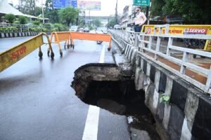 भोपाल। राजधानी के व्यस्ततम इलाकों में शुमार एमपी नगर में एक बड़ी दुर्घटना होते-होते टल गई। ज्योति टॉकीज के पास मुख्य मार्ग पर अचानक सड़क धंस गई, जिससे करीब 10 फीट गहरा गड्ढा बन गया। घटना गुरुवार सुबह की बताई जा रही है, जब राहगीरों ने देखा कि सड़क का एक हिस्सा धीरे-धीरे नीचे बैठने लगा। कुछ ही मिनटों में वह हिस्सा पूरी तरह धंस गया, जिससे यातायात पूरी तरह बाधित हो गया।