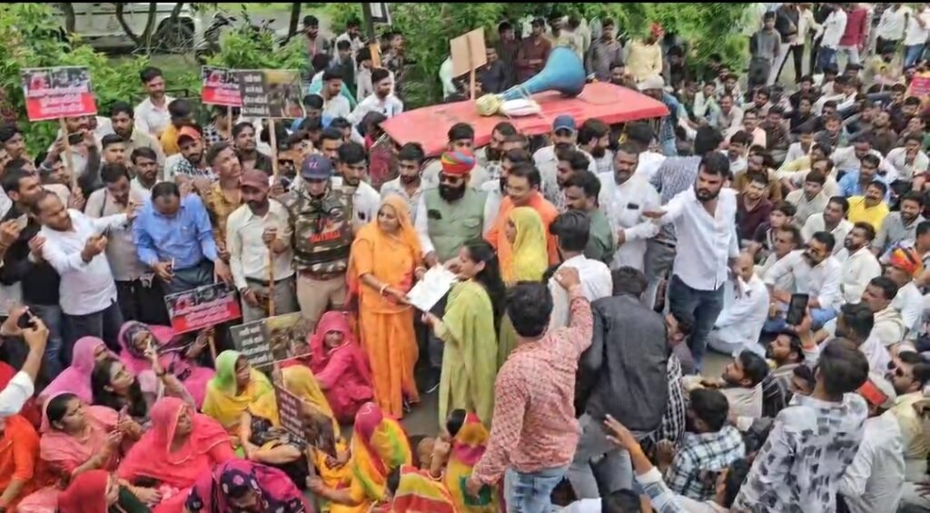शुक्रवार को करणी सेना के आह्वान पर समाजजन नवग्रह तिराहे पर एकत्रित हुए। यहां दोपहर एक बजे नारेबाजी कर आक्रोश रैली के रुप में कलेक्टे्रट पहुंचे। कलेक्ट्रेट में ज्ञापन लेने आई डिप्टी कलेक्टर पूर्वा मंडलोई से कलेक्टर को बुलाने की मांग करते हुए समाजजनों ने धरना दे दिया। करीब डेढ़ घंटे तक चले धरना प्रदर्शन के दौरान भी कलेक्टर के नही पहुंचने पर नाराज समाजजनों ने बगैर ज्ञापन देकर लौटना ही मुनासिब समझा। करणी सेना परिवार के कुलदीप सिंह, ममता सोलंकी, सबल सिंह, प्रताप सिंह, अर्जुन ठाकुर, कैलाश सिंह सयाता, हेमेंद्र सिंह, भीम सिंह, योगेन्द्र सिंह, अजय सिंह आदि ने बताया कि हरदा में शांतिपूर्ण तरीके से अपनी बात रख रहे करणी सेनिको एवं छात्रावास में मौजूद महिलाओं, बच्चो पर पुलिस.प्रशासन द्वारा बर्बरता पूर्वक लाठी चार्ज किया गया है। जिसके विरोध में पूरे प्रदेश में ज्ञापन दिए जा रहे है। प्रदर्शन के दौरान तीन थानों के थाना प्रभारी पुलिस बल के साथ तैनात रहे।