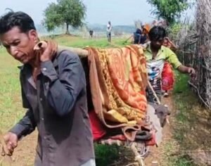 चितरंगी। एक महिला को प्रसव कराने के लिए खाट के माध्यम से अस्पताल ले जाया गया।