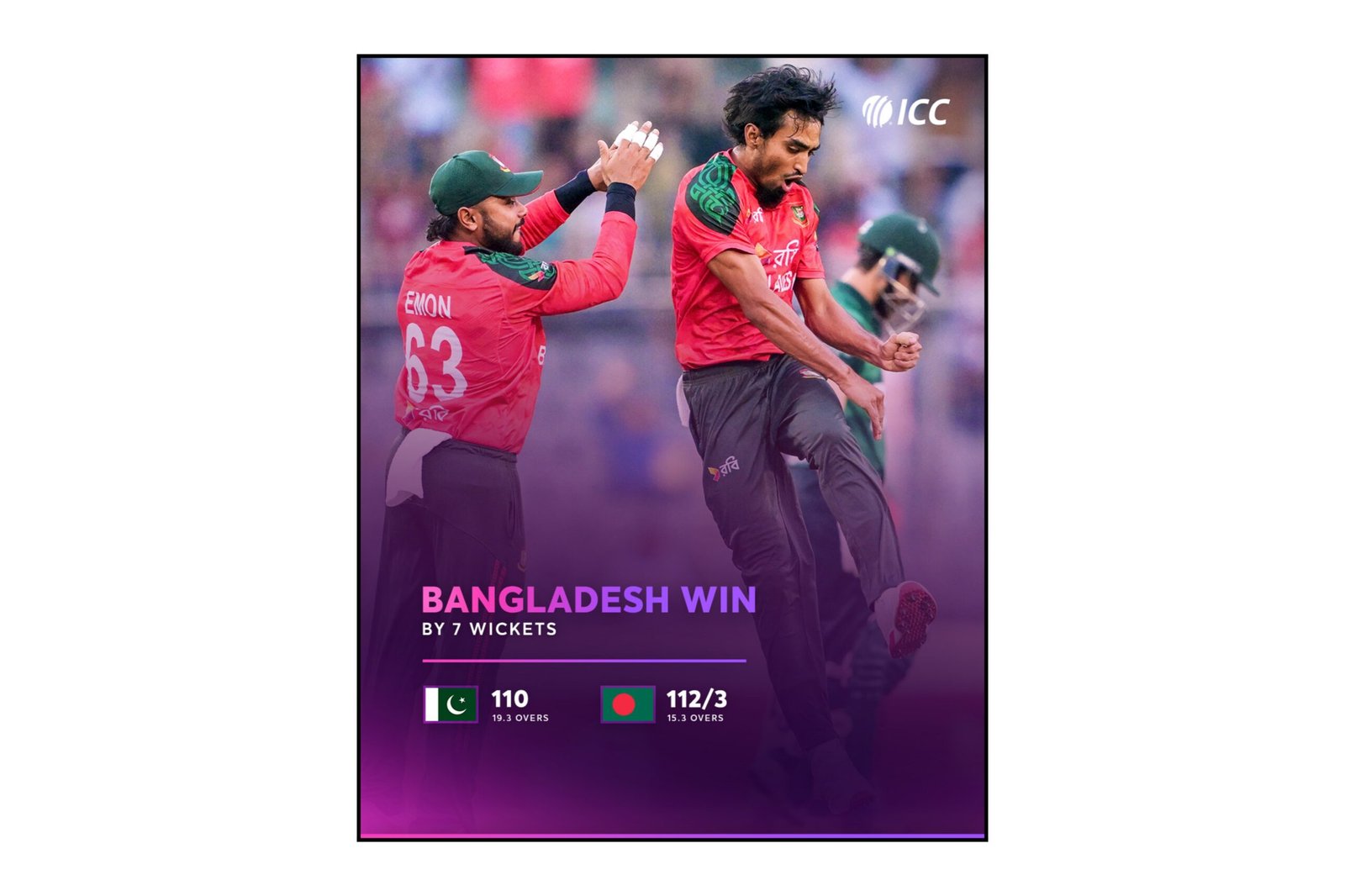 इससे पहले आज यहां बंगलादेश ने टॉस जीतकर पहले गेंदबाजी करने का फैसला किया। बल्लेबाजी करने उतरी पाकिस्तान की शुरुआत अच्छी नहीं रही और उसने लगातार अंतराल पर अपने विकेट गवांये। बंगलादेश के गेंदबाजी आक्रमण के आगे फखर जमान को छोड़कर पाकिस्तान के बल्लेबाज अधिक देर तक नहीं टिक सके। फखर जमान ने 34 गेंदों में छह चौके और एक छक्का लगाते हुए 44 रनों की पारी खेली। खुशदिल शाह (17) और अब्बास अफरीदी 22 रन बनाकर आउट हुये। बंगलादेश गेंदबाजी के आगे पाकिस्तान के आठ बल्लेबाज दहाई आंकड़े तक भी नहीं पहुंच सके। पाकिस्तान के तीन बल्लेबाज रनआउट हुये। बंगलादेश ने पाकिस्तान को 19.3 ओवर में 110 रन के स्कोर पर ढ़ेर कर दिया।