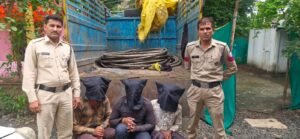 इंदौर: गौतमपुरा पुलिस ने बिजली के एल्युमीनियम तार चोरी करने वाले गिरोह का पर्दाफाश करते हुए तीन आरोपियों को गिरफ्तार किया है. आरोपियों के कब्जे से करीब 4.75 लाख मूल्य के 850 फीट बिजली के तार, एक तार काटने की कटर के साथ पिकअप वाहन जब्त किया है. इस पूरी कार्रवाई में 8.76 लाख का माल बरामद किया बताया जा रहा है.