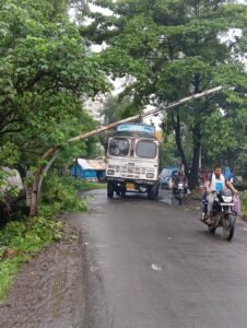 बावजूद अभी तक कोई बिजली के खंभे को हटाने नहीं आया है। नतीजा सड़क पर ये बिजली का पोल लटक रहा है और किसी बड़ी दुर्घटना को निमंत्रण दे रहा है।स्थानीय लोगों की माने तो उन्होनें पेड़ों को खुद ही हटाकर किनारे कर दिया था और बिजली के पोल को रस्सी से बांध दिया है जिससे कि वो किसी के ऊपर न गिरे।