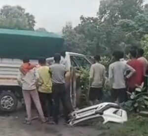 कार–मिनी ट्रक भिड़ंत, रेलिंग तोड़ पुल से लटक गया ट्र
