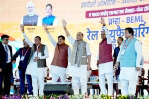 औबेदुल्लागंज: जिले के उमारिया में बीईएमएल रेल हब फॉर मैन्युफैक्चरिंग इकाई का शिलान्यास करते हुए केन्द्रीय रक्षा मंत्री राजनाथ सिंह ने औबेदुल्लगंज के दशहरा मैदान पर आयोजित कार्यक्रम में कहा कि आज मध्यप्रदेश को बहुत बड़ी सौगात मिली है। यह इस क्षेत्र के लिए बड़ा सौभाग्य है।