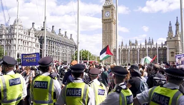गौरतलब है कि सोशल मीडिया पर आई तस्वीरों में प्रदर्शनकारियों को ‘मैं नरसंहार का विरोध करता हूँ’ लिखे हुए पोस्टर पकड़े हुए दिखाया गया है। द गार्जियन अखबार द्वारा जारी एक वीडियो में एक गिरफ्तार महिला कैमरे के सामने यह कहती हुयी दिखाई दे रही है कि उन लोगों को गिरफ्तार करो जो हथियार बेच रहे हैं, हत्या कर रहे हैं और बमबारी कर रहे हैं…।