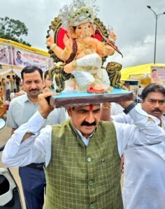 ग्वालियर: प्रदेश के पूर्व गृहमंत्री डॉ. नरोत्तम मिश्रा के डबरा स्थित निवास पर विघ्नहर्ता विराजे। डॉ. मिश्रा स्वयं सिर पर गणपति प्रतिमा को लेकर घर पहुंचे एवं यहां मंत्रोच्चारण के साथ गणपति स्थापना की गई। डॉ. मिश्रा ने ट्वीट कर सभी को गणेश चतुर्थी की शुभकामनाएँ दी।