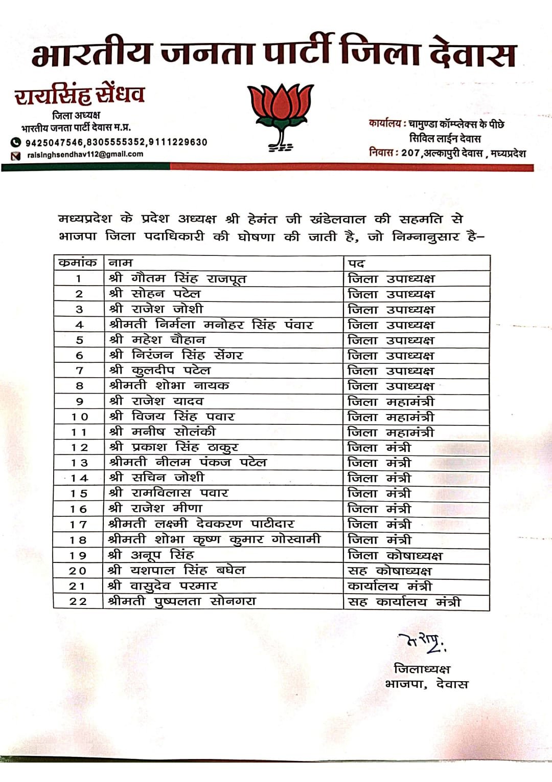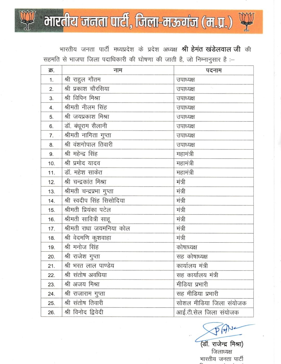 भोपाल। भारतीय जनता पार्टी ने प्रदेश अध्यक्ष हेमंत खण्डेलवाल की सहमति से आज देर रात मऊगंज एवं देवास जिलों के जिला पदाधिकारियों की घोषणा की है। पार्टी द्वारा जारी सूची के अनुसार नवगठित टीम को आगामी समय में संगठन को और अधिक सशक्त बनाने की जिम्मेदारी सौंपी गई है। पार्टी ने स्पष्ट किया है कि नए पदाधिकारियों से अपेक्षा है कि वे बूथ स्तर तक संगठन को मजबूत बनाने में सक्रिय योगदान देंगे। दोनों जिलों के पदाधिकारी इस प्रकार हैं।