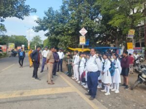 जबलपुर। शहर के एक स्कूल द्वारा दो पहिया वाहनों पर छात्र-छात्राएं बिना हेलमेट रैली निकाल रहे थे, जिन्हें यातायात पुलिस ने रोका और एकत्रित कर हेलमेट लगाने, यातायात संबंधित नियमों को पालन करने समझाइश दी गई, भविष्य में ऐसी गलती होने पर कठोर कार्यवाही करने चैतावनी दी। जानकारी के अनुसार आदित्य कॉन्वेंट स्कूल में साइकिल रैली आयोजित की गई थी। रैली में शामिल होने वाले कुछ छात्र अपने दोपहिया वाहनों जैसे एक्टिवा एवं मोटरसाइकिल से आए थे। निरीक्षण के दौरान यह पाया गया कि कई छात्र बिना हेलमेट एवं बिना लाइसेंस के वाहन चला रहे थे। ऐसे छात्रों को एकत्रित कर उन्हें हेलमेट की अनिवार्यता एवं बिना लाइसेंस वाहन चलाने के दुष्परिणामों के संबंध में समझाइश दी गई। साथ ही, भविष्य में ऐसी गलती पुनः करने पर कठोर वैधानिक कार्यवाही किए जाने की चेतावनी भी दी गई। इसके अलावा स्कूल प्रबंधन को भी जागरूक रहकर यातायात नियमों का पालन कराने तथा विद्यार्थियों को निरंतर यातायात संबंधी जागरूकता प्रदान करने निर्देशित किया गया। यह कार्यवाही मालवीय चौक डीएसपी संतोष कुमार शुक्ला के निर्देशन में हुई, कार्यवाही के दौरान सूबेदार रोहित तिवारी सहित यातायात पुलिस कर्मी मौजूद थे।