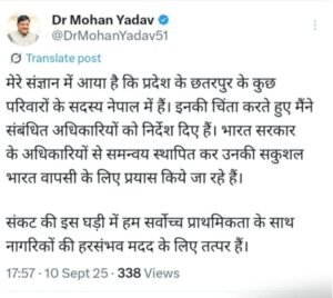 नेपाल में पिछले कुछ दिनों से राजनीतिक अस्थिरता और विरोध प्रदर्शनों के चलते कई स्थानों पर हिंसा की घटनाएँ हो रही हैं। इससे परिवहन और जनजीवन प्रभावित हुआ है। इन परिस्थितियों में छतरपुर के परिवारों के फँसे होने से स्थानीय स्तर पर चिंता बढ़ गई है। मुख्यमंत्री ने भरोसा दिलाया कि प्रशासन और राज्य सरकार लगातार स्थिति पर नजर रखे हुए हैं और जल्द ही परिवारों की सुरक्षित वापसी सुनिश्चित की जाएगी।