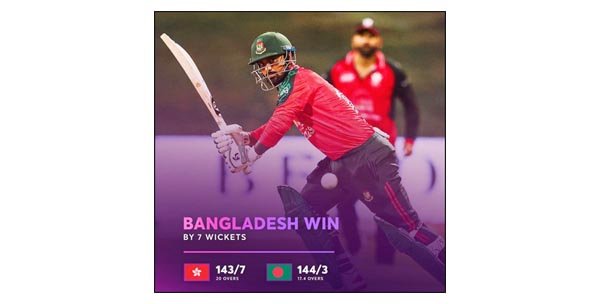 हांगकांग को 20 ओवर में सात विकेट पर 143 रन पर रोकने के बाद बांग्लादेश ने अपने कप्तान की अर्धशतकीय पारी की मदद से 17.4 ओवर में तीन विकेट पर 144 रन बनाकर टूर्नामेंट में जीत के साथ आगाज किया।