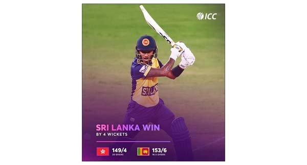 150 रनों के लक्ष्य का पीछा करने उतरी श्रीलंका की शुरुआत अच्छी नहीं रही और उसने चौथे ही ओवर में कुसल मेंडिस (11) का विकेट गंवा दिया। उन्हें आयुष शुक्ला ने आउट किया। दूसरे विकेट के रूप में कामिल मिशारा (19) को एजाज खान ने आउट किया। इसके बाद बल्लेबाजी करने आये कुशल परेरा ने पथुम निसंका के साथ तीसरे विकेट लिए 57 रन जोडकर टीम को जीत की ओर ले गये। इसी दौरान हांगकांग ने 16वें ओवर में श्रीलंका के 119 के स्कोर पर दो विकेट झटक कर मैच में रोमांच पैदा कर दिया। पथुम निसंका (68) रनआउट हुये। उन्होंने अपनी पारी में छह चौके और दो छक्के लगाये। अगली ही गेंद पर यासिन मुर्तजा ने कुशल परेरा (20) को पगबाधा आउटकर दिया। कप्तान चरित असलंका (दो) को एहसान खान ने आउट किया। 18वें ओवर की पहली गेंद पर यासिन मुर्तजा ने कामिंडु मेंडिस (पांच) को आउटकर मैच पर अपनी पकड़ बना ली। इसके बाद बल्लेबाजी करने आये वानिंदु हसरंगा ने पारी को संभाला और तेजी के साथ रन बटोरे। उन्होंने 19वें ओवर की पांच गेंदों में 12 रन ठोकर कर अपनी टीम की जीत पक्की की। श्रीलंका ने 18.5 ओवर में छह विकेट पर 153 रन बनाकर मुकाबला चार विकेट से जीत लिया।