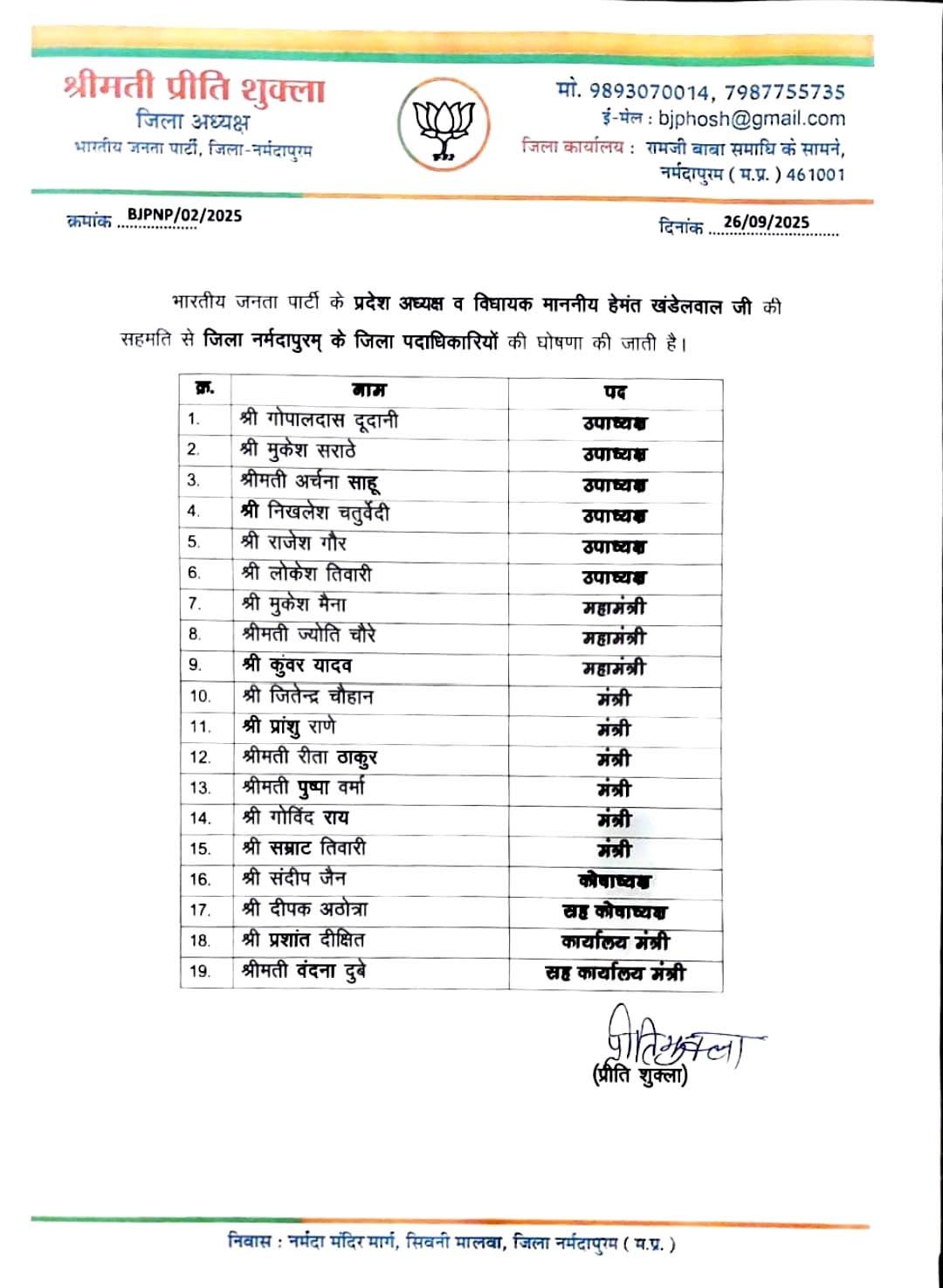भोपाल।भारतीय जनता पार्टी के प्रदेश अध्यक्ष हेमंत खण्डेलवाल की सहमति से नर्मदापुरम जिले के जिला पदाधिकारियों की घोषणा की गई है, जो निम्नानुसार है :-