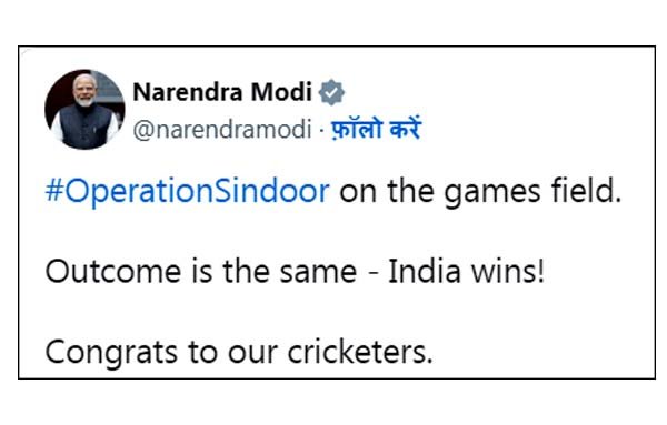 प्रधानमंत्री नरेंद्र मोदी ने दुबई में एशिया कप फाइनल में भारत की पाकिस्तान पर पांच विकेट से जीत के लिये क्रिकेट टीम को बधाई देते हुए कहा कि खेल के मैदान पर आपरेशन सिंदूर और नतीजा भारत की जीत ही रहा।