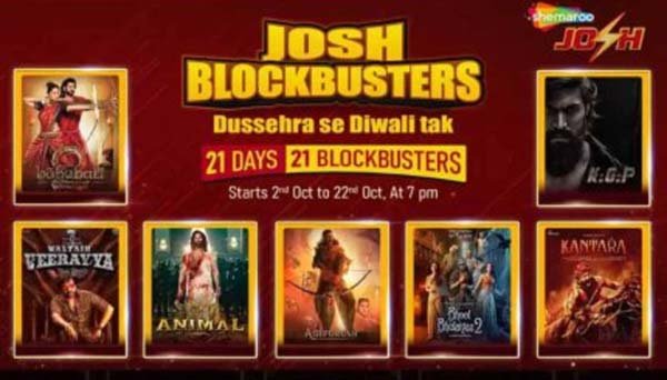 त्यौहारों की रौनक और बॉलीवुड के जादू के साथ, शेमारू जोश लेकर आ रहा है 21 दिन का जश्न, 21 ब्लॉकबस्टर फिल्मों के साथ । जहाँ एक्शन से भरपूर केजीएफ: चैप्टर 1 और एनिमल फिल्म आपके रोमांच को बढ़ाएगी। वहीं, रोमांस के दीवानों के लिए है तू झूठी मैं मक्कार, जिसमें रणबीर कपूर और श्रद्धा कपूर की धमाकेदार केमिस्ट्री सबका दिल जीत लेगी। डर और हँसी का अनोखा कॉम्बिनेशन है भूल भुलैया 2 और देसी मिट्टी की खुशबू और रहस्य से भरपूर कहानी है कांतारा , जिसने पूरे भारत में दर्शकों का दिल छू लिया। 02 अक्टूबर से 22 अक्टूबर तक दर्शकों को ब्लॉकबस्टर फिल्में देखने को मिलेगी।