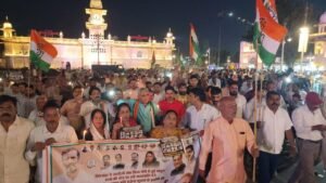 ग्वालियर। जहरीले कफ सिरप से छिंदवाड़ा में बच्चों की मौत को लेकर कांग्रेस पार्टी ने कैंडल मार्च निकाला। जिलाध्यक्ष सुरेन्द्र यादव के नेतृत्व में राक्सी से महाराज बाड़ा तक गुरूवार रात को निकाले गये कैंडल मार्च में बड़ी संख्या में कांग्रेस के नेता व कार्यकर्ता शामिल हुये। उन्होंने सरकार की लापरवाही के खिलाफ नारेबाजी की तथा दोषियों के खिलाफ कार्रवाई की मांग की। जिलाध्यक्ष यादव का कहना था कि सरकार व स्वास्थ्य मंत्री की लापरवाही से बड़ी संख्या में बच्चों की मौत हुई है। नैतिकता के आधार पर स्वास्थ्य मंत्री को अपना पद छोड़ देना चाहिये। सरकार को चाहिये कि वह दोषी अधिकारियों के खिलाफ कड़ी कार्रवाई करें। कैंडल मार्च में प्रमुख रूप से प्रदेश प्रवक्ता धर्मेन्द्र शर्मा, पिंकी पंडित, सीमा समाधिया, मीनू परिहार, वीर सिंह तोमर, अरविंद, शरद यादव, इब्राहिम पठान सहित बड़ी संख्या में कांग्रेस कार्यकर्ता शामिल हुये।