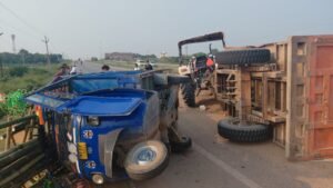 ग्वालियर। ग्वालियर डबरा हाईवे पर ट्रैक्टर ट्राली और मेटाडोर लोडिंग गाड़ी में टक्कर हो गई। तेज स्पीड ट्रैक्टर ट्राली चालक ने मेटाडोर लोडिंग गाड़ी को टक्कर मार दी। ट्रैक्टर ट्राली का पिछला हिस्सा पलटा और मेटाडोर लोडिंग भी पलट गई। ट्रैक्टर ट्राली में ओवरलोड रेत भरी थी जिसके कारण एक्सीडेंट हुआ। मौके से ट्रैक्टर ट्राली चालक गायब हो गया। हाईवे पर एक्सीडेंट के कारण लंबा जाम लग गया है।