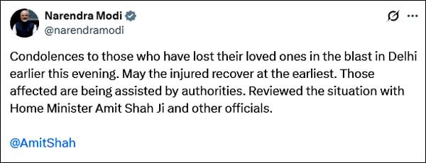 श्री मोदी ने सोशल मीडिया प्लेटफॉर्म एक्स पर एक पोस्ट में लिखा, “दिल्ली में आज शाम हुए विस्फोट में जिन्होंने अपने प्रियजनों को खोया है उनके प्रति संवेदना व्यक्त करता हूं। मैं घायलों के शीघ्र स्वस्थ होने की कामना करता हूं। अधिकारी प्रभावित लोगों की मदद कर रहे हैं। गृह मंत्री अमित शाह और अन्य अधिकारियों के साथ स्थिति की समीक्षा की।”