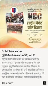 भोपाल: राष्ट्रीय कैडेट कोर दिवस के अवसर पर मुख्यमंत्री डॉ. मोहन यादव ने एक्स पर पोस्ट कर प्रदेश व देशभर के एनसीसी कैडेटों को हार्दिक बधाई एवं शुभकामनाएं दीं।सीएम डॉ. यादव ने अपने संदेश में कहा कि एनसीसी युवाओं में एकता और अनुशासन के मूल्यों को मजबूत बनाते हुए राष्ट्र सेवा की भावना को नई ऊर्जा देता है।