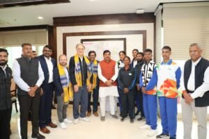 भोपाल।मुख्यमंत्री डॉ. मोहन यादव से शहडोल के ग्राम विचारपुर के फुटबॉल खिलाड़ियों ने मंगलवार को मंत्रालय में भेंट की। खिलाड़ियों के साथ उनके जर्मन प्रशिक्षक डाइटमर बायर्सडार्फर, मैनुअल शेफ़र और खेल संचालक राकेश गुप्ता भी उपस्थित रहे। मुख्यमंत्री डॉ. यादव ने समस्त खिलाड़ियों को उत्कृष्ट प्रदर्शन के लिए बधाई और भावी स्पर्धाओं में सफलता के लिए शुभकामनाएं दीं। मुख्यमंत्री डॉ. यादव ने दोनों अंतर्राष्ट्रीय प्रशिक्षकों का स्वागत किया।