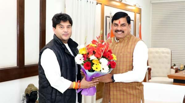 भोपाल। बुधवार की शाम मुख्यमंत्री निवास पर एक महत्वपूर्ण शिष्टाचार मुलाकात के दौरान मुख्यमंत्री डॉ. मोहन यादव से केंद्रीय संचार एवं पूर्वोत्तर विकास मंत्री ज्योतिरादित्य सिंधिया ने भेंट की। दोनों नेताओं के बीच प्रदेश से जुड़े विभिन्न विकासात्मक मुद्दों पर सौहार्दपूर्ण वातावरण में चर्चा हुई।