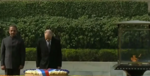 नयी दिल्ली, 05 दिसंबर (वार्ता) भारत यात्रा पर आए रूसी राष्ट्रपति व्लादीमीर पुतिन ने शुक्रवार को राजघाट जाकर महात्मा गांधी को श्रद्धासुमन अर्पित किए।श्री पुतिन ने बापू की समाधि पर सिर झुकाया और परिक्रमा की। उन्होंने एक पुष्प चक्र चढ़ाया और बापू के प्रति अपनी कृतज्ञता प्रकट की। उन्होंने राजघाट पर रखी स्मारिका में भी दस्तखत किए। श्री पुतिन भारत की दो दिवसीय यात्रा पर आए हुए हैं। इससे पहले उनका राष्ट्रपति भवन में औपचारिक स्वागत किया गया और उन्हें सलामी गारद दी गयी। श्री पुतिन का आज शाम सात बजे भारत से रवाना होने का कार्यक्रम है।