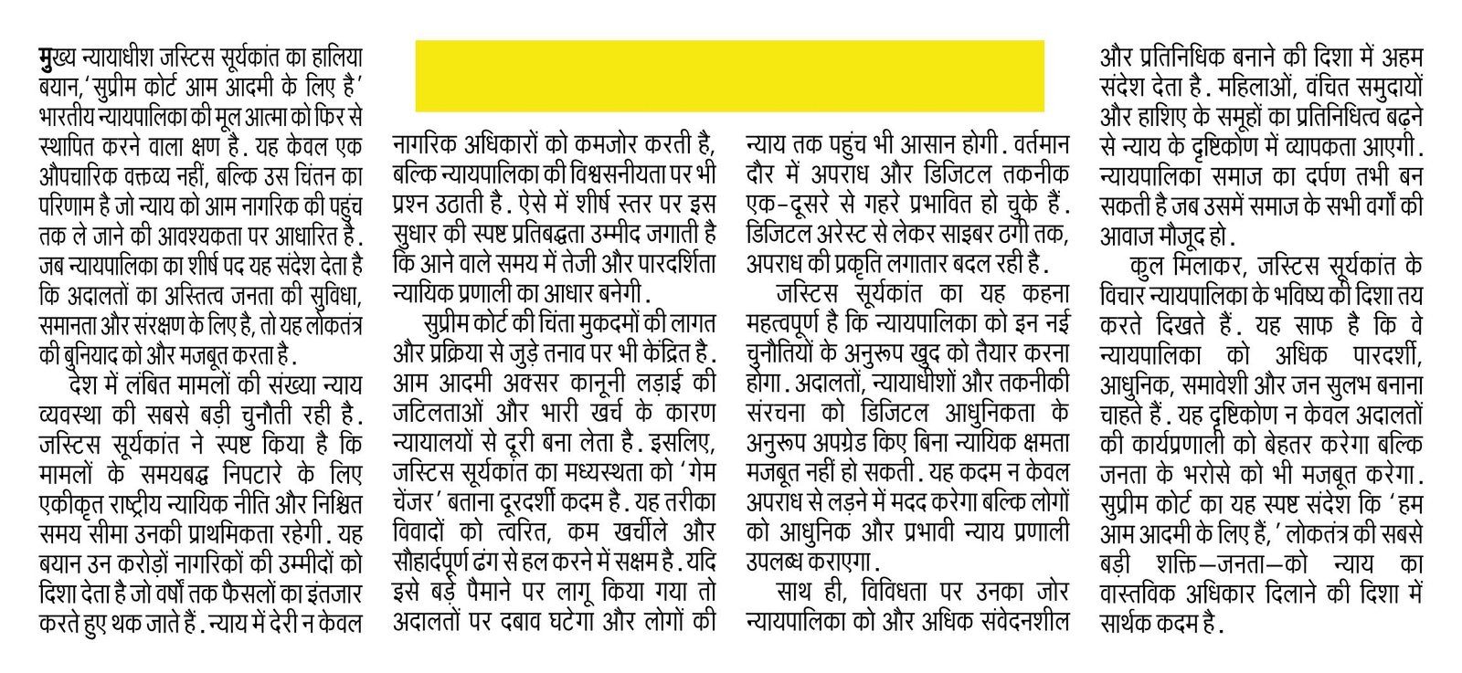 फीचर्ड न्यूज़ संपादकीय सीजेआई का आशा जगाने वाला संदेश .. 1 month ago FacebookShare on XLinkedInWhatsAppEmailCopy Link