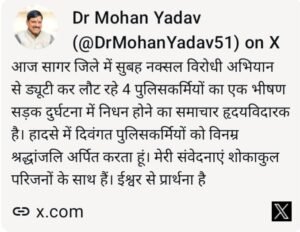 भोपाल: सागर जिले में आज सुबह नक्सल-विरोधी अभियान से ड्यूटी कर लौट रहे पुलिस दल का वाहन भीषण सड़क दुर्घटना का शिकार हो गया, जिसमें चार पुलिसकर्मियों की दर्दनाक मौत हो गई। हादसे की जानकारी मिलते ही पूरे प्रदेश में शोक की लहर दौड़ गई।मुख्यमंत्री डॉ. मोहन यादव ने इस हृदयविदारक घटना पर गहरी संवेदना व्यक्त करते हुए दिवंगत पुलिसकर्मियों को विनम्र श्रद्धांजलि अर्पित की।
