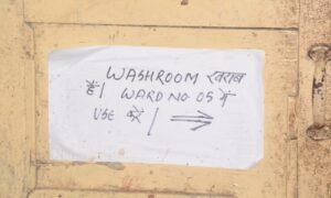 जिला चिकित्सालय के पुरुष सर्जिकल वार्ड क्र. 1 का वाशरुम खराब है. जिसके चलते वाशरुम के दरवाजे पर ताला लगा दिया गया है. इसके साथ ही उक्त वाशरुम के दरवाजे पर एक पर्ची चस्पा कर दी गई है कि यहां का वाशरुम खराब है, लिहाजा वार्ड क्र. 5 में उपयोग करें. वहां पर नए नए भर्ती हुए मरीजों को शुरु में तो कुछ समझ में ही नहीं आया. लेकिन जब उन्हें आवश्यकता महसूस हुई और उन्होंने पर्ची के निर्देशानुसार वार्ड क्र. 5 का रुख किया तो वहां का दृश्य देखकर वे सकुचा गए.