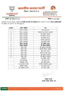 भोपाल। भारतीय जनता पार्टी के प्रदेश अध्यक्ष हेमंत खण्डेलवाल की सहमति से धार जिले के जिला पदाधिकारियों की घोषणा कर दी गई है। पार्टी संगठन को और अधिक मजबूत करने के उद्देश्य से गठित इस जिला समिति में सात उपाध्यक्ष, दो महामंत्री एवं छह मंत्री नियुक्त किए गए हैं।