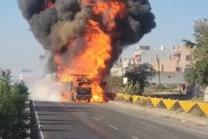 इंदौर. सोमवार सुबह मुंबई आगरा फोरलेन पर उस वक्त हड़कंप मच गया, जब सड़क किनारे खड़े दो भारी वाहनों में अचानक आग भड़क उठी. आग की लपटें और काला धुआं इतनी दूर तक फैल गया कि करीब एक किलोमीटर दूर से दिखाई देने लगा. देखते ही देखते सड़क पर लंबा जाम लग गया और दोनों ओर का यातायात पूरी तरह बाधित हो गया.