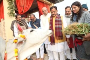 रीवा। नववर्ष के प्रथम दिवस पर उप मुख्यमंत्री राजेन्द्र शुक्ल ने बसामन मामा गौवंश वन्य विहार में गौपूजन किया तथा गौमाता को गुड़ एवं गौग्रास खिलाया. उप मुख्यमंत्री ने भगवान श्री कृष्ण के दर्शन कर आशिर्वाद प्राप्त किया तथा प्रदेश वासियों के सुख समृद्धि की कामना. श्री शुक्ल ने रात्रि विश्राम के उपरांत नववर्ष की प्रभात बेला में गौमाताओं की सेवाकर आशिर्वाद लिया. उप मुख्यमंत्री ने बसामन मामा गौवंश वन्य विहार में गोलोक दर्शन महोत्सव का शुभारंभ भी किया. गोलोक दर्शन में आमजन गौशाला का भ्रमण करते हुए गायों का पूजन कर सकते हैं.