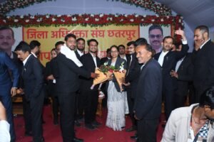 छतरपुर। अधिवक्ता संघ छतरपुर के शपथ ग्रहण समारोह के दौरान मुख्य न्यायिक मजिस्ट्रेट (CJM) छतरपुर का जूनियर अधिवक्ताओं द्वारा सम्मान किया गया। समारोह के अवसर पर जूनियर अधिवक्ताओं ने CJM को गुलदस्ता भेंट कर उनका अभिनंदन किया और शुभकामनाएं दीं।