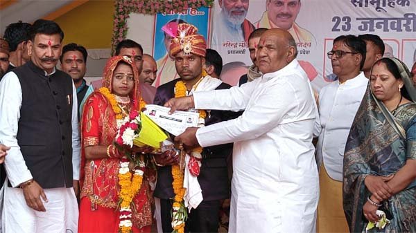 उन्होंने नवदंपतियों को भावी दांपत्य जीवन के लिए शुभकामनाएं देते हुए आशीर्वाद प्रदान किया. सामूहिक कन्या विवाह सम्मेलन में कुल 200 जोड़े परिणय सूत्र में बंधे, जिनमें 173 जोड़ों का विवाह तथा 27 जोड़ों का निकाह संपन्न हुआ. समारोह में बड़ी संख्या में जनप्रतिनिधि, अधिकारी एवं नागरिक उपस्थित रहे. इस मौके पर राजस्व मंत्री वर्मा ने कहा कि प्रधानमंत्री नरेंद्र मोदी व मुख्यमंत्री डॉ. मोहन यादव के नेतृत्व में देश और प्रदेश में विकास के साथ-साथ जनकल्याण को प्राथमिकता देते हुए अनेक योजनाएं संचालित की जा रही हैं. उन्होंने कहा कि प्रधानमंत्री आवास योजना से गरीबों का पक्का मकान का सपना साकार हो रहा है तथा पात्र परिवारों को निशुल्क राशन उपलब्ध कराया जा रहा है. मंत्री वर्मा ने बताया कि आयुष्मान भारत योजना के माध्यम से नागरिकों को अच्छे अस्पतालों में नि:शुल्क उपचार की सुविधा मिल रही है. महिलाओं को धुएं से मुक्ति दिलाने के लिए उज्ज्वला योजना चलाई जा रही है. उन्होंने कहा कि समाज का कोई ऐसा वर्ग नहीं है, जिसे सरकार की योजना का लाभ न मिल रहा हो. शासन की योजनाएं अंतिम पंक्ति में खड़े व्यक्ति तक लाभ पहुंचाने के उद्देश्य से संचालित की जा रही हैं. कार्यक्रम को भाजपा जिला उपाध्यक्ष कैलाश सुराना ने भी संबोधित किया. कार्यक्रम में जिला पंचायत अध्यक्ष रचना सुरेन्द्र मेवाड़ा, जनपद पंचायत अध्यक्ष रेखा जगदीश पटेल, जनपद पंचायत उपाध्यक्ष नीलू शंकर जायसवाल उपस्थित थे.