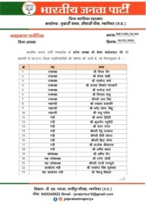ग्वालियर। प्रदेश भाजपा अध्यक्ष हेमंत खंडेलवाल की सहमति से भारतीय जनता पार्टी ग्वालियर महानगर जिले के नए पदाधिकारियों की घोषणा कर दी गई है। इस सूची में कुल 34 नेताओं को संगठनात्मक जिम्मेदारी सौंपी गई है। ग्वालियर भाजपा की नई कार्यकारिणी में अनुभव और युवा जोश का संगम है। भाजपा […]