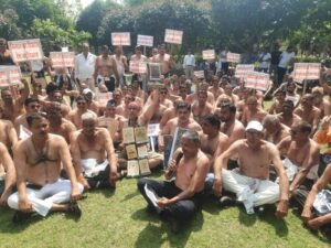 इंदौर। आज कलेक्ट्रेट कार्यालय में पूर्वी रिंग रोड और इंदौर मनमाड़ रेल परियोजना के किसानों ने अर्धनग्न होकर प्रदर्शन किया। इस दौरान किसानों हाथों में तख्तियां लेकर नारेबाजी कर चार गुना मुआवजा और सड़क का अलॉयमेंट बदलने की मांग कर रहे थे।