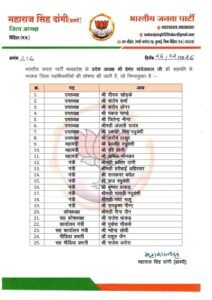 भोपाल: भारतीय जनता पार्टी के प्रदेश अध्यक्ष हेमंत खण्डेलवाल की सहमति से आज विदिशा जिला के पदाधिकारियों की घोषणा की गई है, समिति में आठ उपाध्यक्ष तीन महामंत्री और आठ मंत्री बनाए गए हैं। जिला समिति निम्नानुसार है ।