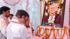 सतना।मध्यप्रदेश के उप मुख्यमंत्री राजेंद्र शुक्ल ने शुक्रवार को पद्मश्री डॉ. बी के जैन के चित्रकूट स्थित निवास पहुंचकर उनके चित्र पर पुष्पांजलि अर्पित की और शोक संवेदना व्यक्त की। उप मुख्यमंत्री श्री शुक्ल ने परिजनों से मुलाकात कर दुख की इस घड़ी में उन्हें ढाढस बंधाया।
